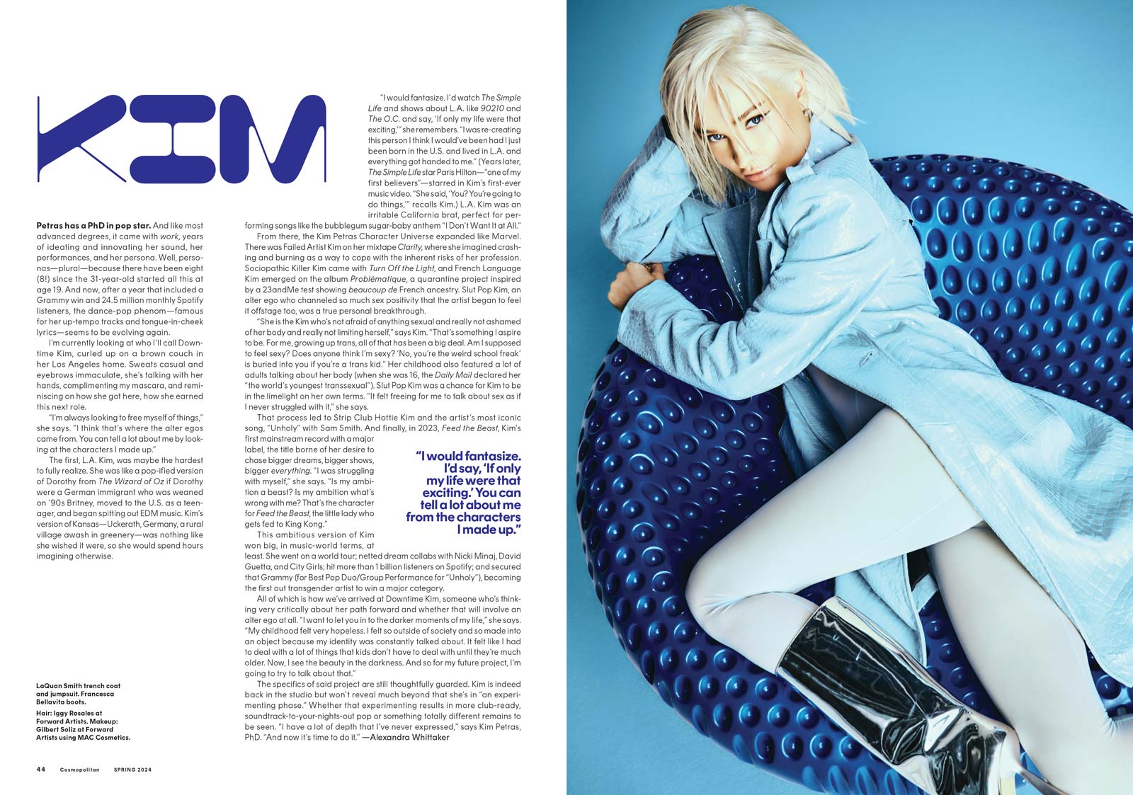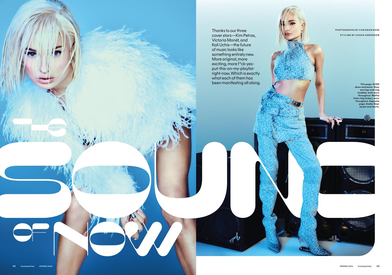 Cosmopolitan cover and editorial titled “The Sound of Now”, celebrating the future of music with three different cover stars: Kim Petras, Kali Uchis, and Victoria Monét. Kim’s icy metallic glam—cool-toned lids, crystalline highlights, and glacial, hyper-polished skin—transforms classic cinematic romance into something boldly modern. The inspiration? A harmony of alpine crispness and sci-fi shimmer, where every reflective surface catches light like a high note, turning her entire look into a visual symphony of cold-front couture.